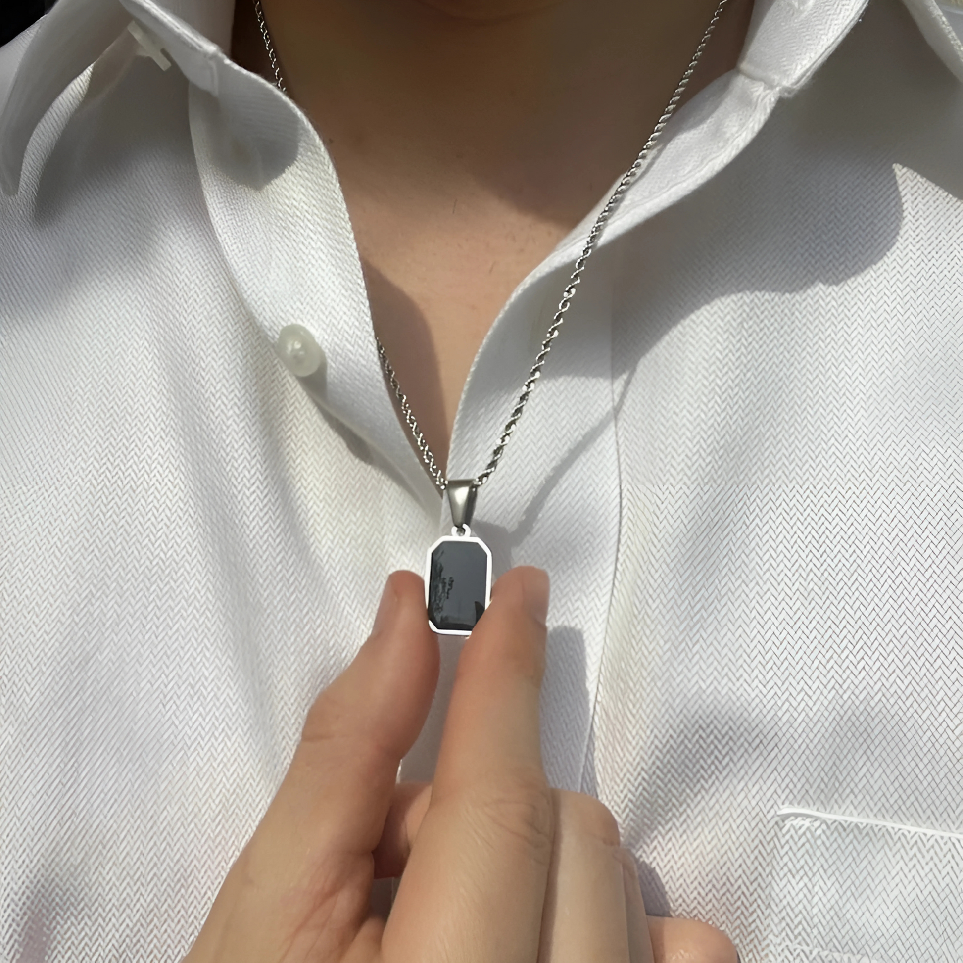 Our Classic Black Pendant Necklace is designed for those who appreciate clean lines and a modern aesthetic. The rectangular black pendant, beautifully encased in a polished frame, creates a striking contrast against the choice of a lustrous gold or a sophisticated silver chain.